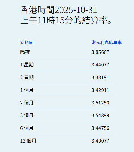 10月31日,港元拆息普遍向上,隔夜息报3.85667%,升78.203基点;一周拆息跌5.881基点,报3.44077%,两周则跌6.595基点,报3.38191%。与楼按相关的一个月拆息止跌回升报3.42911%,升1.375基点。