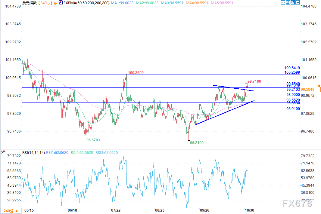 汇通财经APP讯——周五(10月31日)欧洲交易时段,美元指数(DXY)徘徊在99.50附近。由于市场对美联储进一步降息的预期增强,美联储主席鲍威尔的鹰派言论所产生的影响被削弱了,美元汇率波动不大。