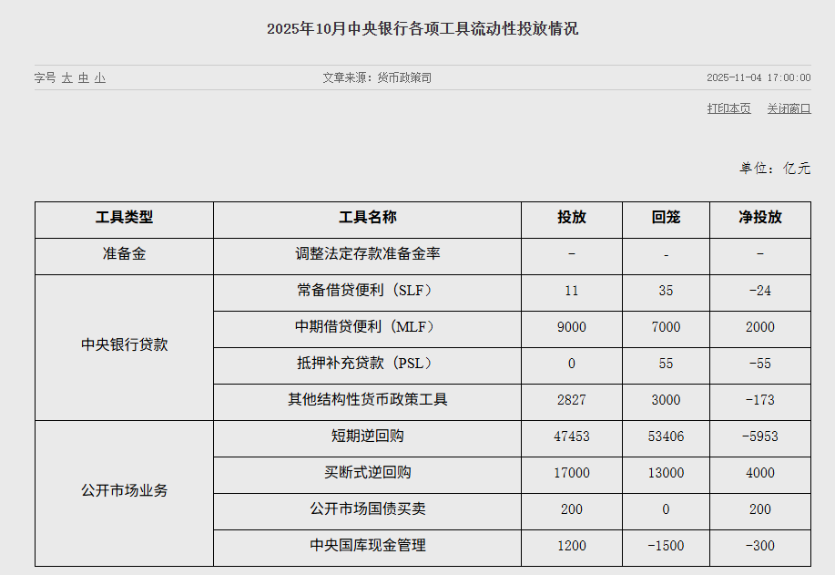 11月4日,中国人民银行发布2025年10月中央银行各项工具流动性投放情况。数据显示,央行10月恢复公开市场国债买卖,净投放200亿元,中期借贷便利净投放2000亿元,买断式逆回购净投放4000亿元。
