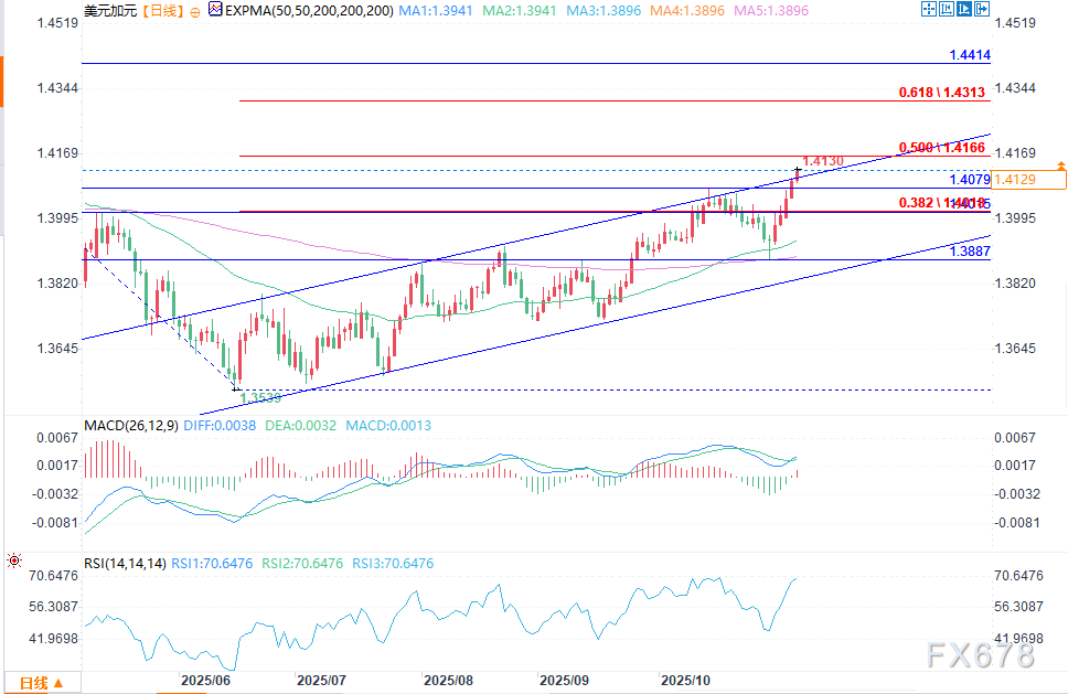 汇通财经APP讯——周三(11月5日)欧洲交易时段,美元/加元汇率连续第五个交易日上涨,盘中报1.4131,涨幅0.21%。日线图技术分析显示,该货币对向上突破上涨通道,看涨趋势稳固。