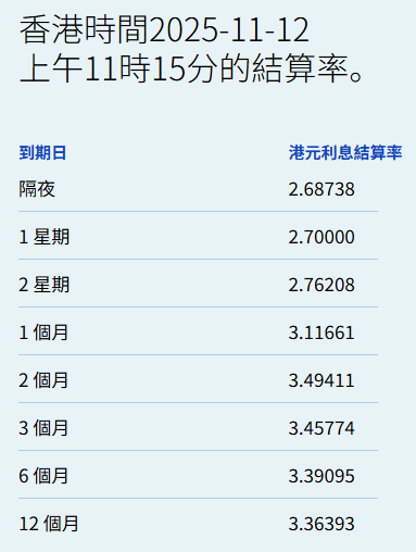 11月12日,港元拆息全线上扬,而与楼按相关的一个月拆息终止七连跌,报3.11661%,升9.679基点;反映银行资金成本的三个月拆息报3.45774%,升2.417基点。