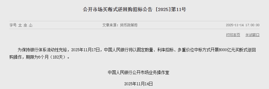 中国人民银行11月14日消息,为保持银行体系流动性充裕,11月17日(下周一),中国人民银行将以固定数量、利率招标、多重价位中标方式开展8000亿元买断式逆回购操作,期限为6个月(182天)。