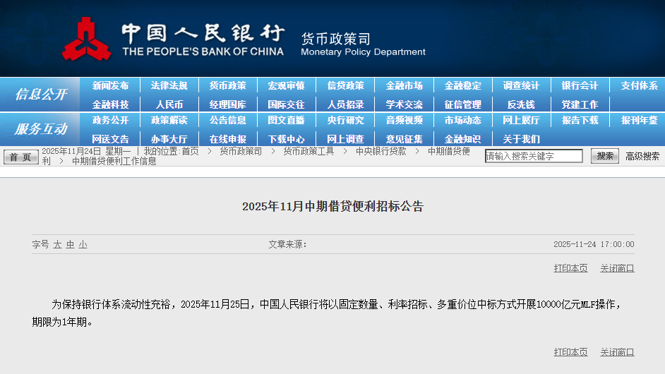 大河财立方消息,央行11月24日公告,为保持银行体系流动性充裕,2025年11月25日,中国人民银行将以固定数量、利率招标、多重价位中标方式开展10000亿元MLF操作,期限为1年期。