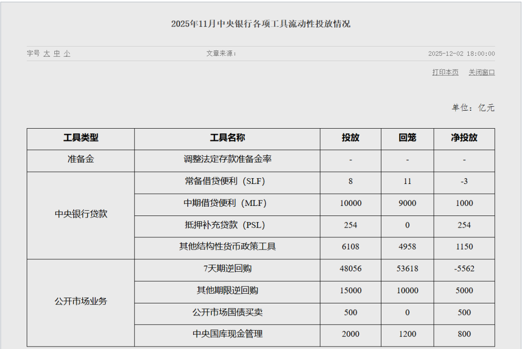 刚刚,央行发布11月中央银行各项工具流动性投放情况