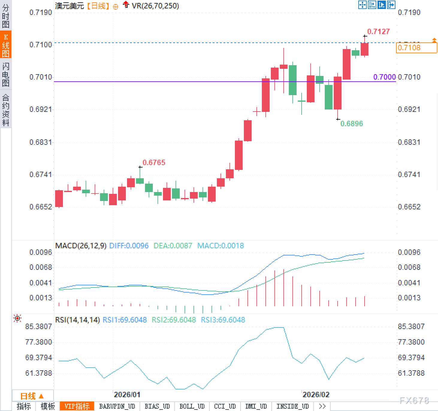 汇通财经APP讯——近期澳元兑美元持续走强,2月11日周三北美时段交投0.7100附近,接近阶段性高位。自前期低点0.6896企稳以来,汇价走出清晰的上升结构,不仅收复了0.7000这一重要心理关口,还在其上方多次确认支撑有效,显示出多头信心逐步增强。技术面上看,日线图呈现明显的抬升趋势,RSI指标运行至69.6048,虽已接近超买区域但仍保持向上动能;MACD方面,DIFF为0.0096,DEA为0.0087,柱状值为0.0018,整体仍处于多头格局之中。这表明当前市场情绪偏乐观,上涨趋势尚未出现明显衰竭信号。